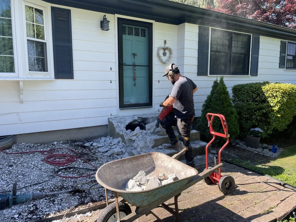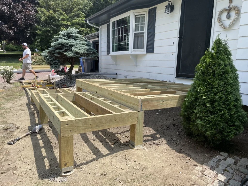 Removed cement steps and paved walkway. Built a porch with a boardwalk walkway. Installed aluminum posts and stainless wire railing